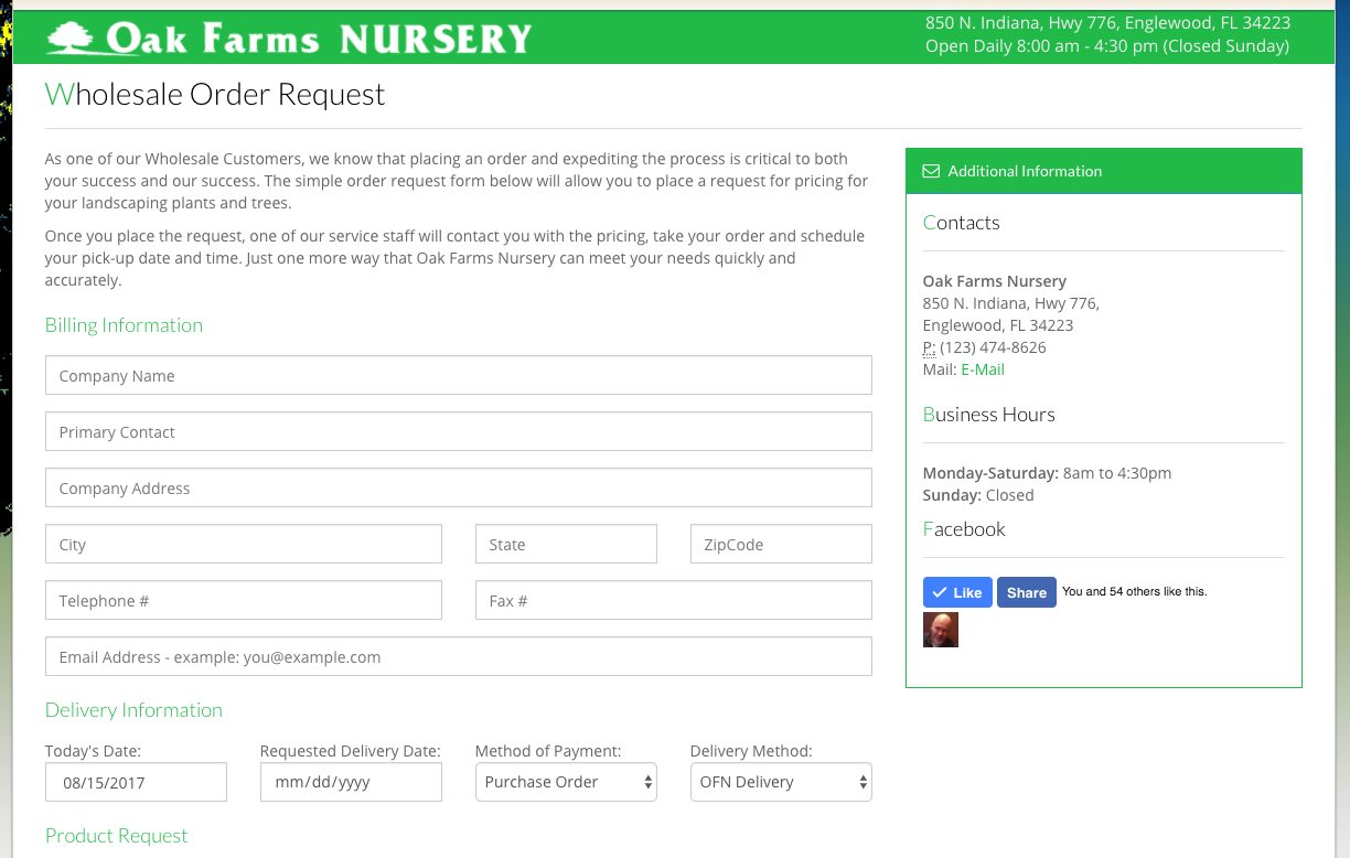 Oak Farms Nursery is proud to offer a unique online ordering service for its Wholesale Customers. Just email us for your login and password to the wholesaler order form, and you are on your way to simplifying and expediting your orders with Oak Farms Nursery. Just send your wholesale request by following this link: REQUEST FOR WHOLESALE ORDERING